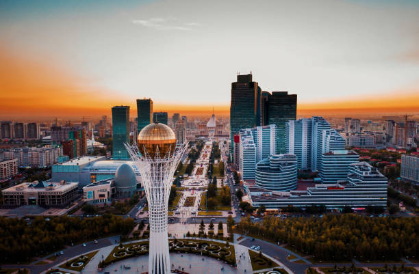Aerial view of Baiterek monument – symbol of Kazakh people freedom duruing beautiful sunset